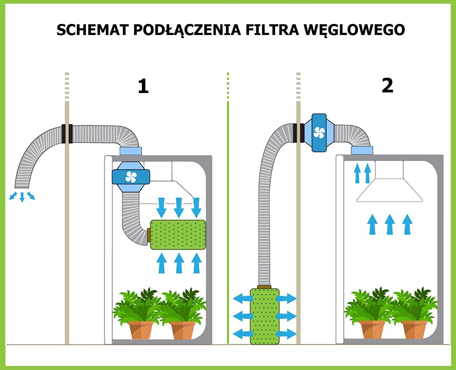 Przedstawione na ilustracji podłączenia systemów wentylacji są prawidłowe. W obu filtrowanie powietrza będzie przebiegać optymalnie, choć naszym zdaniem w podłączeniu nr.2 skróci się żywotność filtra węglowego - czas eksploatacji. Dzieję się tak ponieważ powierzchnia absorpcji we wnętrzu filtra jest znacznie mniejsza od zewnętrznej powierzchni chłonnej, dodatkowo filtry węglowe na zewnętrznej części posiadają filtr wstępny ( tkaninowy materiał absorbujący większe części drobinek kurzu ) co znaczne wydłuża żywotność filtrów. Dobrym zwyczajem jest wymiana filtra wstępnego po każdym cyklu uprawowym. takie działania znacznie podniosą skuteczność absorpcji niechcianych zapachów.