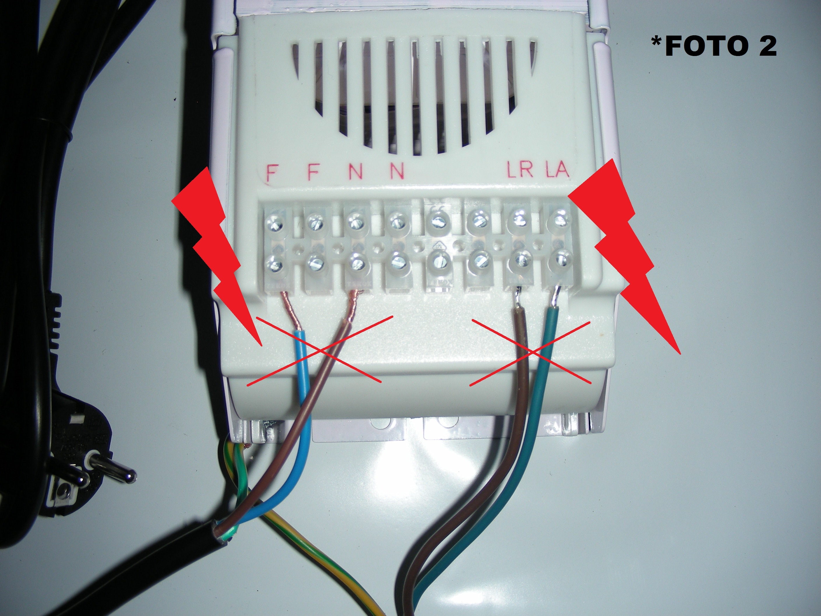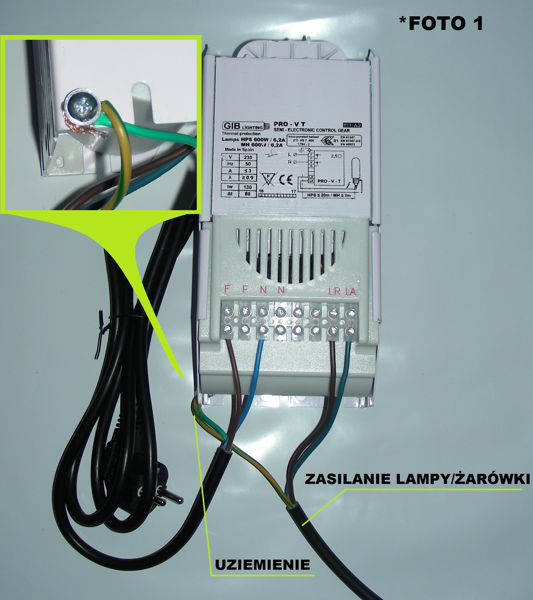 Do prawidłowego połączenia układu zasilającego ( PRO-V-T, PRO-I-T ) z lampami wyładowczymi MH / HPS użyj przewodów zasilających o przekroju od Ø 1.5² do Ø 2.5² ( w zależności od mocy zapłonu ). Patrz foto 1.