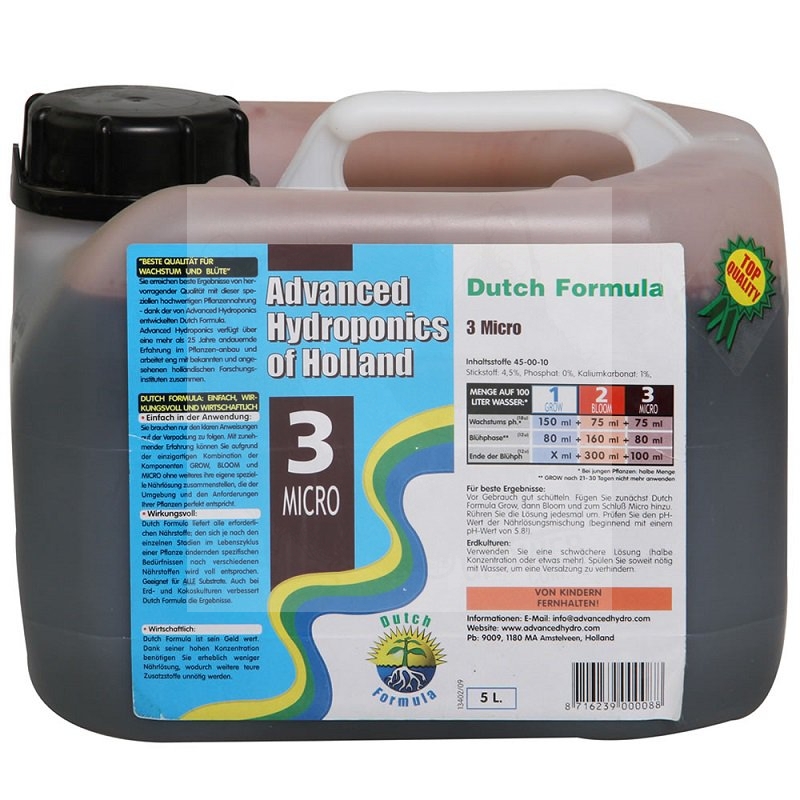 Advanced Hydroponics Micro to trzeci z trójskładnikowego zestawu nawozów mineralnych wysokiej jakości wyprodukowany w Holandii, przeznaczony do wszystkich rodzajów podłoży (hydro, kokos, ziemia).