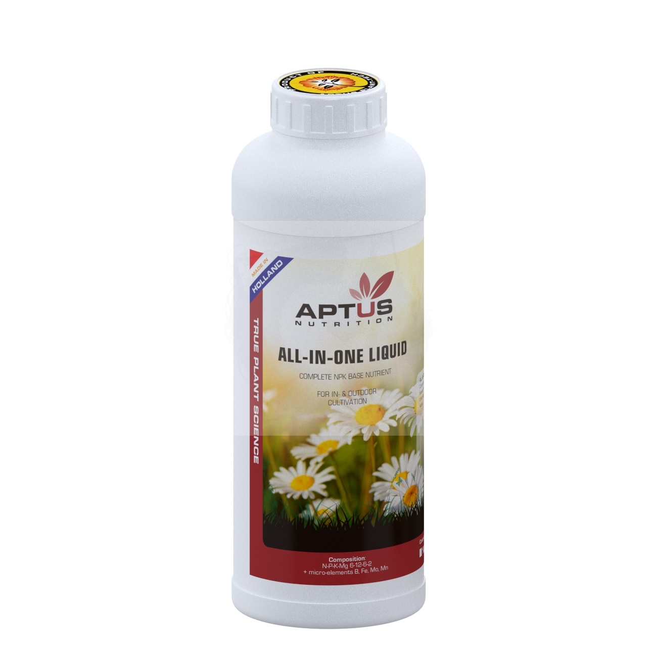 Jeden płyn dla wszystkich podłoży All-in-One Liquid to w 100% mineralny nawóz odpowiedni dla wszystkich mediów i systemów. Może być stosowany przy wielu różnych uprawach. Do zastosowania od fazy wegetatywnej do fazy kwitnienia. Unikalny proces produkcji sprawia, że All-in-One Liquid nie jest wrażliwy na zmiany pH i dlatego ma zastosowanie w szerokim zakresie. Jest w 100% mineralnym nawozem zawierającym niezbędne pierwiastki: azot, fosfor, potas, magnez i mikroelementy: bor, molibden, żelazo, mangan, cynk i miedź.