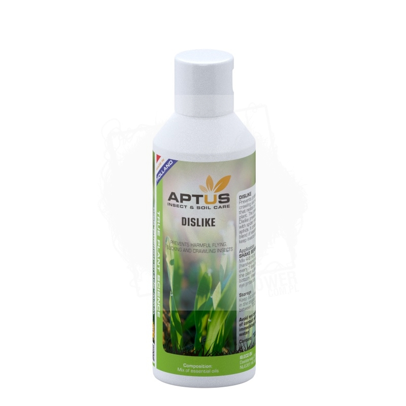 Aptus Dislike składa się z mieszanki olejków eterycznych. Te olejki posiadają specjalne zadanie, trzymanie insektów z dala od rośliny, Kombinacja 5 olejków zawarta w jednym produkcie gwarantuje szerokie spektrum podjęcia akcji. Aptus Dislike jest jedynym takim produktem na rynku, który zawiera tak skondensowaną formułę.