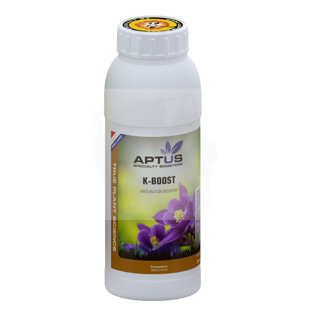 Rośliny wymagają więcej potasu podczas fazy dojrzewania. Aptus K-Boost zawiera potas ( K ) i aminokwasy. Jest w pełni rozpuszczalny w wodzie i nie pozostawia osadu. Aptus K-Boost to organiczno-mineralny produkt, który wyróżnia biodostępność składników aktywnych. Ma silny stymulujący wpływ na proces dojrzewania, zwiększa wydajność i poprawia jakość.