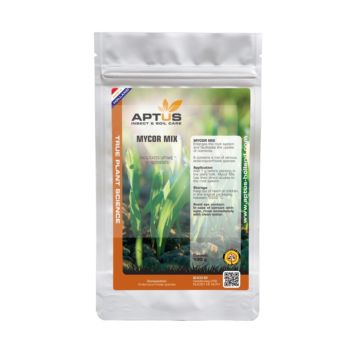 Aptus Mycor Mix zawiera mieszankę różnych gatunków grzybów mikoryzowych. To dobroczynne grzyby, które łączą się z systemem korzeniowym. Drobne nici strzępkowe przekazują substancje odżywcze do systemów korzeniowych i faktycznie powiększają powierzchnię ( x 700 ) z której rośliny mogą wchłaniać składniki odżywcze.