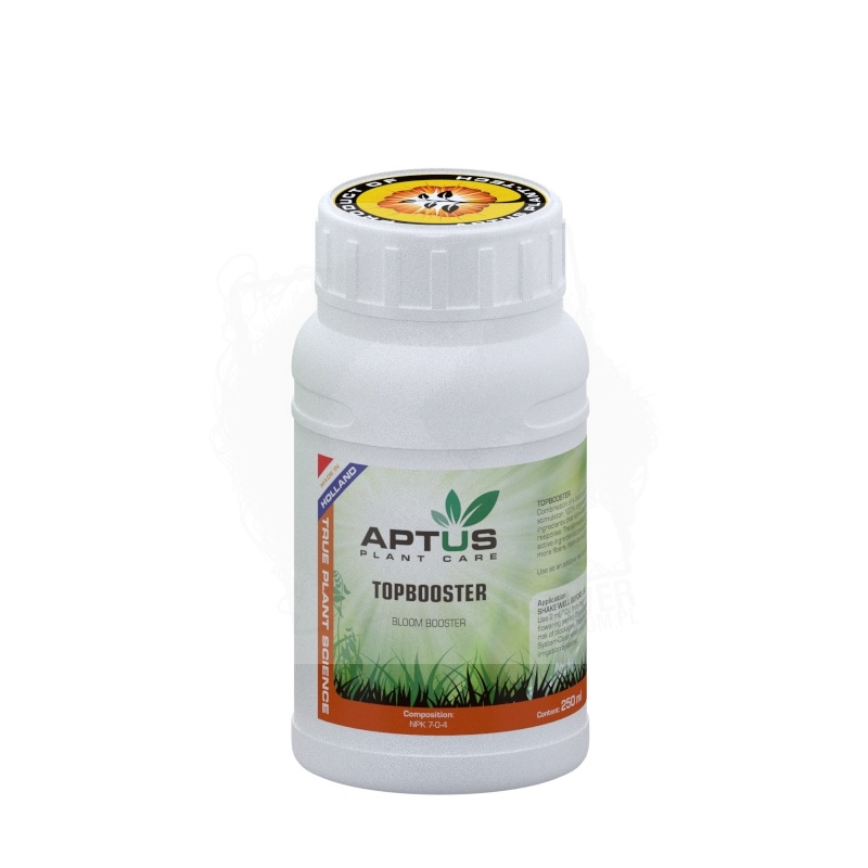 Podobnie jak Startbooster, jest mocno skoncentrowanym produktem, który zawiera wiele aktywnych składników, mają stymulujący wpływ na proces kwitnienia. Aptus Topbooster daje duże pąki kwiatowe wypełnione dużą ilością włókien, żywic i cukrów. Rośliny potraktowane za pomocą Aptus Topbooster będą wyróżniać się jakością produktu końcowego. Żaden inny produkt nie ma tak silnego wpływu na wygląd i smak. Aptus Topbooster jest bardzo skoncentrowany, a przez to tani w użyciu. Mała butelka często wystarcza do pełnego cyklu wzrostu, ponieważ stosuje się małe dawki.