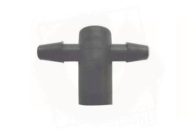Złączka kątowa z dwoma króćcami odpływowymi nakładana na króciec odpływowy kroplownika umożliwia podłączenie dwóch wężyków 5/3 mm.