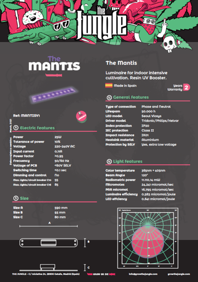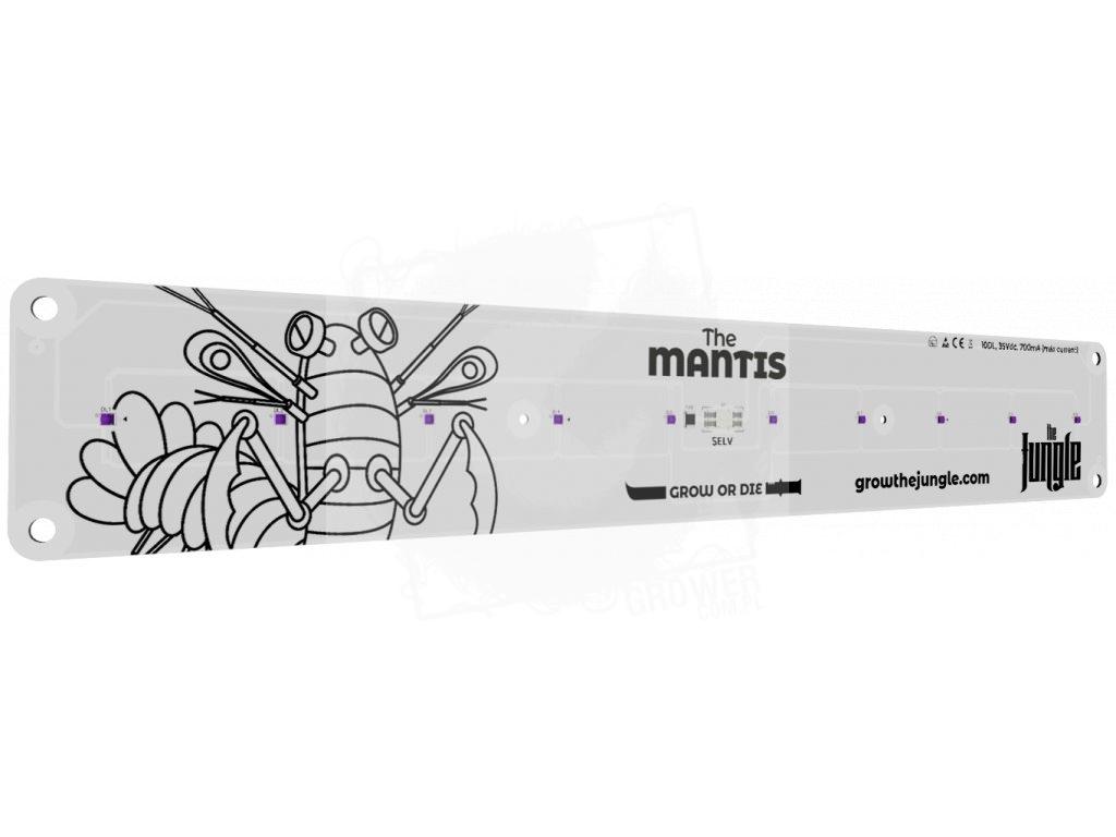 Lampa LED Grow The Jungle MANTIS 25W jest dodatkowym światłem stworzonym w celu poprawy produkcji żywicy, zwiększenia siły, uniknięcia szkodników i polepszenia produkcji terpenów w kwiatach.
