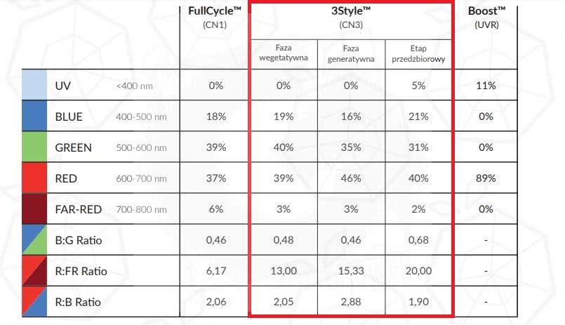 Na podstawie badań wyselekcjonowano widmo zapewniające roślinom najlepsze warunki do rozwoju w fazie wegetatywnej i generatywnej oraz okresie poprzedzającym zbiory. Zmiana proporcji kolorów pomiędzy poszczególnymi trybami gwarantuje odpowiedni przyrost korzeni i wzrost rośliny, przyspiesza jej kwitnienie i utrzymuje prawidłowy przebieg fotosyntezy. W okresie przed zbiorami dodatek światła UV zwiększa syntezę związków organicznych, dzięki czemu poprawia się jakość plonów. Spektrum 3Style zostało stworzone by sprostać wymaganiom pasjonatów uprawy roślin.