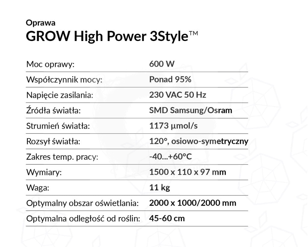 HIGH POWER LEDowa oprawa oświetleniowa 600 W dedykowana do upraw na większych areałach w dużych namiotach lub w pomieszczeniach uprawowych. Zalecamy stosowanie 450 - 500 W/m2 uprawy. Optymalny obszar oświetlania 200 x 100/200 cm.