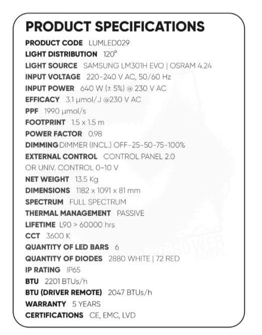 Nowa wersja 3.1 ZEUS – godny następca zwycięzcy nagrody Spannabis za najlepszy produkt do uprawy ZEUS 600W PRO 2.9 – jest zbudowana przy użyciu wysokiej jakości, wydajnych sterowników LUMATEK i najnowszej generacji diod LED Top Bin firmy Samsung LM301H EVO i Osram 4.24 generujących światło o pełnym spektrum źródło idealne do uprawy w pełnym cyklu. Technologia przezroczystej osłony klejącej na listwach LED zapewnia wyższą przepuszczalność światła wynoszącą 99% bez większych strat świetlnych, dłuższą żywotność diod, dodatkową odporność na korozję i stopień ochrony IP65.