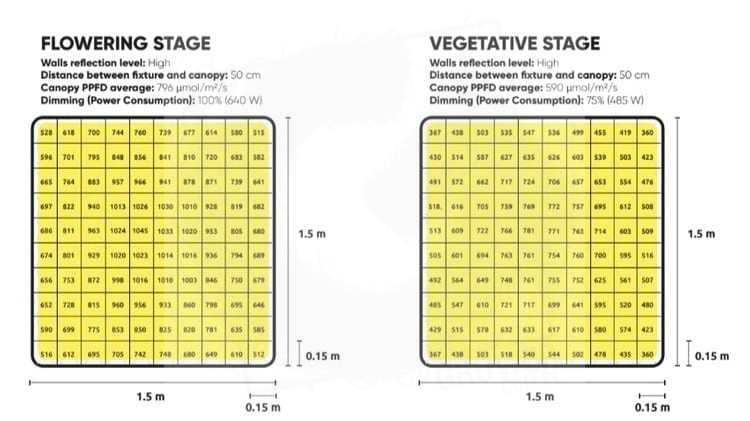 Dzięki ciągłym postępom w technologii diod, firma LUMATEK zwiększyła strumień fotonów, zwiększając ogólną dostępność fotonów w obszarze wzrostu o 10%. Ten ulepszony model skutecznie pokrywa przestrzeń o wymiarach 1,5 x 1,5 m, odpowiednią zarówno dla fazy wegetatywnej, jak i kwitnienia roślin.