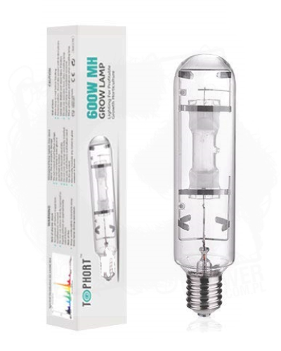 Lampa / żarówka metalohalogenkowa 600W Model: TOPHORT 600W MH Wydajność świetlna: 60,000 lumenów Gwint: E40 Barwa: 4200 K Spektrum światła: wzrost Żarówka wymaga zasilacza HPS/MH o tej samej mocy.