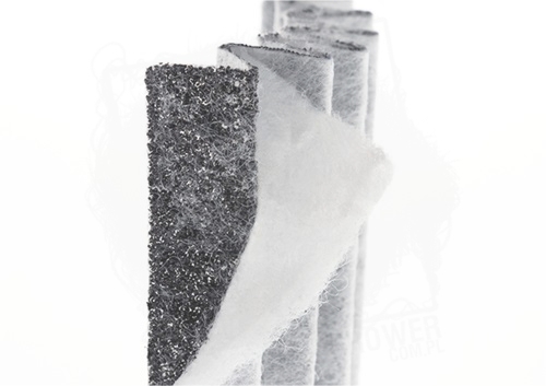Potrójna warstwa filtrująca: filtr wstępny + 2 warstwy węgla = najwyższa skuteczność filtrowania. Filtr wstępny zatrzymuje pył i inne drobne zanieczyszczenia, dwie warstwy maty zawierającej węgiel aktywny powstrzymuje niechciane zapachy. Innowacyjna konstrukcja filtra polegająca na nawinięciu jednej maty z węglem na drugą matę z węglem skutkuje najwyższym poziomem powstrzymania niechcianego zapachu. Obie maty z węglem aktywnym są ułożone harmonijkowo aby zwiększyć powierzchnię styczności powietrza z węglem. Dzięki harmonijkowej budowie - w porównaniu do klasycznych filtrów węglowych, zdecydowanie mocniej tłumi hałas układu wentylacyjnego.
