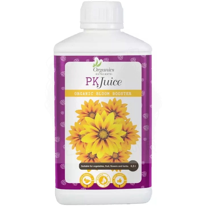 PK JUICE to w 100 % naturalny płynny nawóz wspomagający i intensyfikujący kwitnienie. Dzięki optymalnej ilości fosforu i potasu (5-8) oraz innych mikroelementów (Ca, Mg, Mn, S, Fe, B, Cu i Zn) zapewnia korzystne warunki w fazie kwitnienia.