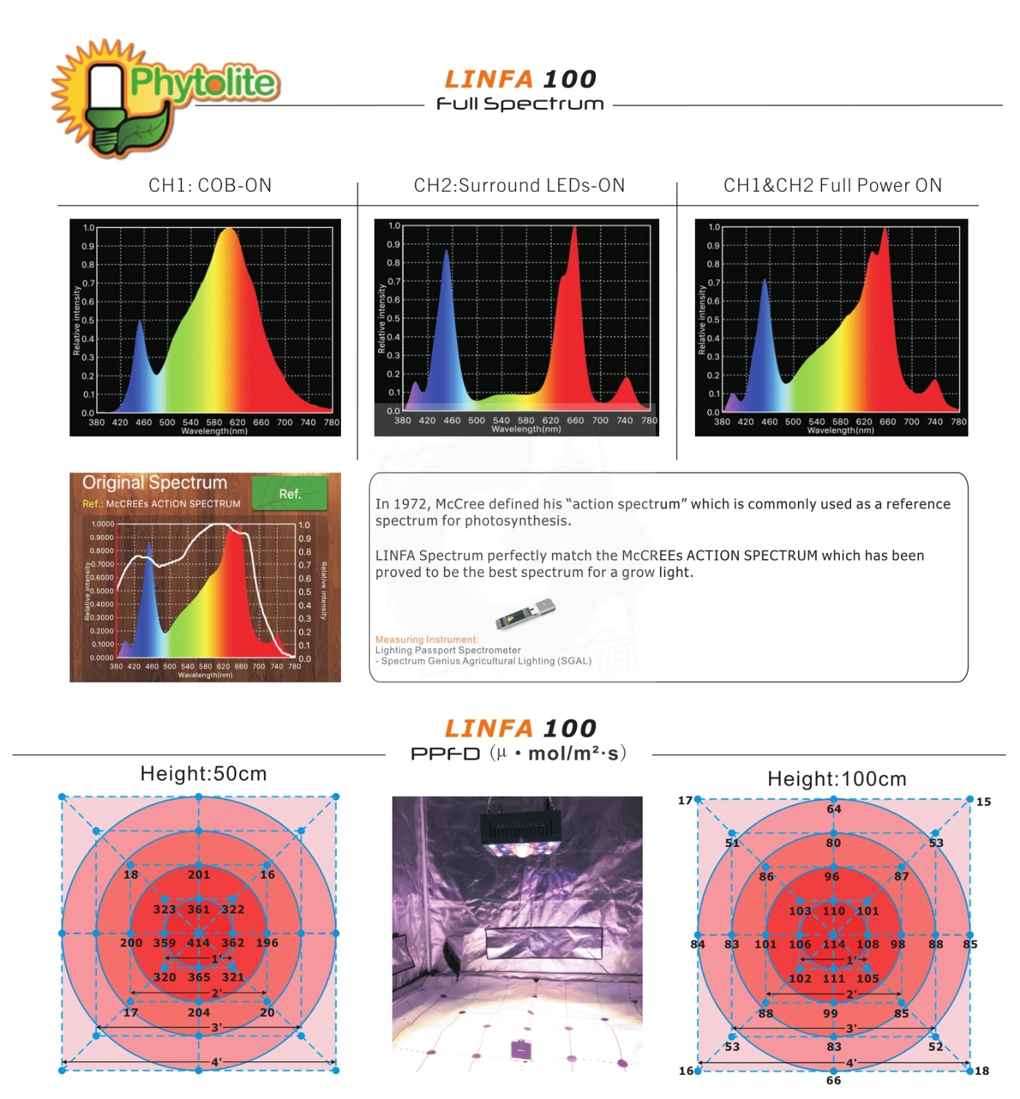 Linia paneli Linfa emituje w centralnym punkcie ponad dwukrotnie więcej światła w porównaniu do lamp HPS. Uzyskano ten wynik, używając COB CXA2530 CREE, który ma doskonały stosunek ceny do wydajności, a także wzmocniono i uzupełniono widmo za pomocą diod LED BridgeLux w zakresie czerwono-niebieskim. Wysokiej jakości soczewka z przepuszczalnością światła ponad 95% zwiększa wydajność PAR i penetrację światła nawet o 250% przy jednoczesnym zapewnieniu bardziej jednolitej powierzchni oświetlania. Rezultatem jest linia produktów, która oferuje wysoką wydajność w niskiej cenie.