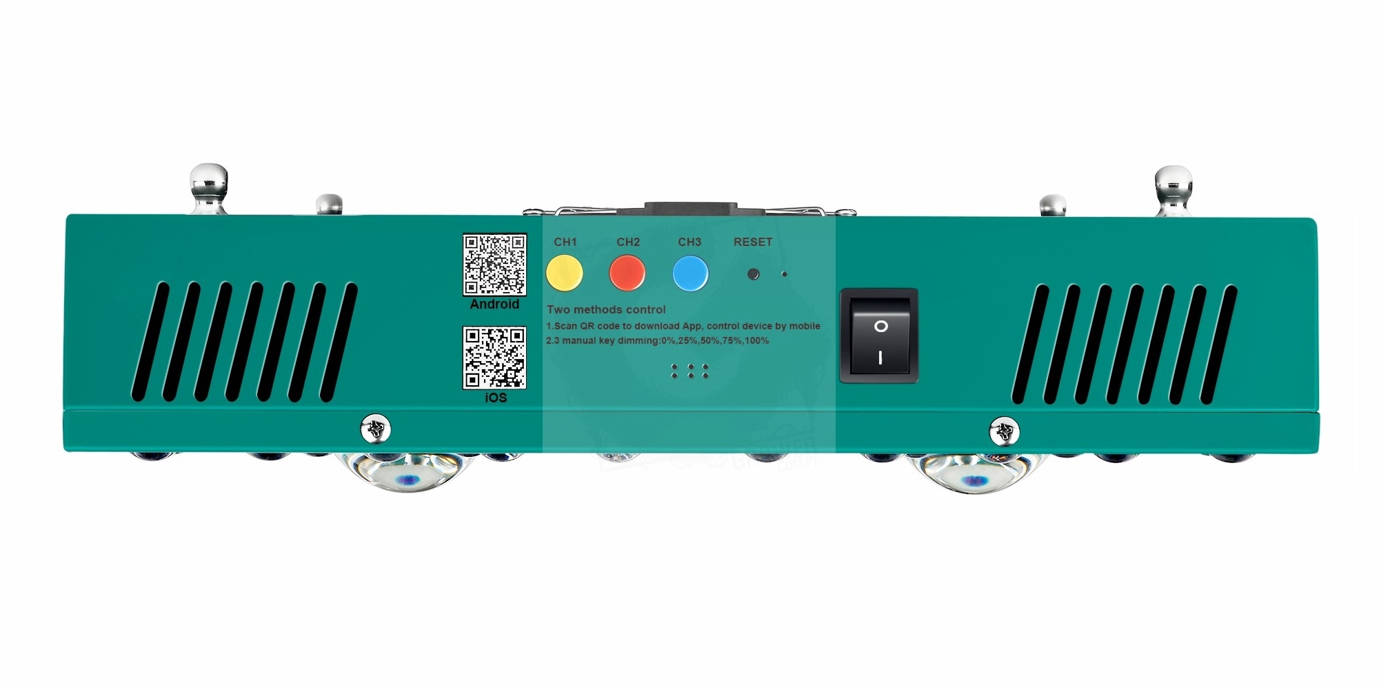 W każdym z nich można regulować poziom natężenia mocy 0-25-50-75-100%, naciskając przycisk na obudowie. Regulując trzy kanały, można uzyskać różne tryby emisji.