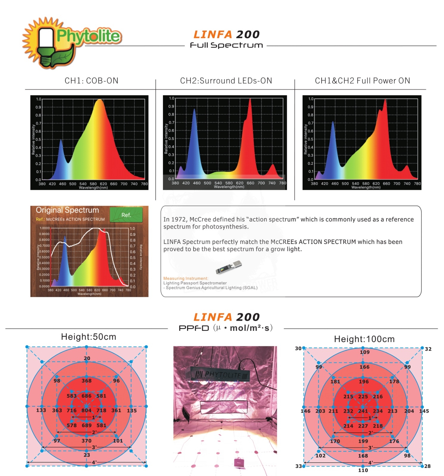 Linia paneli Linfa emituje w centralnym punkcie ponad dwukrotnie więcej światła w porównaniu do lamp HPS. Uzyskano ten wynik, używając COB CXA2530 CREE, który ma doskonały stosunek ceny do wydajności, a także wzmocniono i uzupełniono widmo za pomocą diod LED BridgeLux w zakresie czerwono-niebieskim. Wysokiej jakości soczewka z przepuszczalnością światła ponad 95% zwiększa wydajność PAR i penetrację światła nawet o 250% przy jednoczesnym zapewnieniu bardziej jednolitej powierzchni oświetlania. Rezultatem jest linia produktów, która oferuje wysoką wydajność w niskiej cenie.