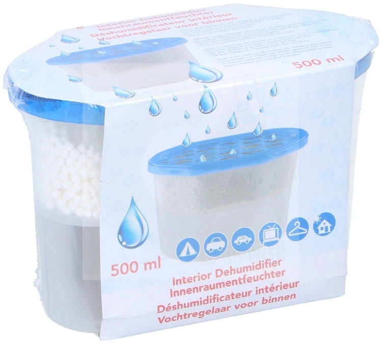 Pochłaniacz wilgoci 500ml z granulkami w formie wygodnego wiaderka do umieszczenia wszędzie tam gdzie występuje nadmierna wilgoć.