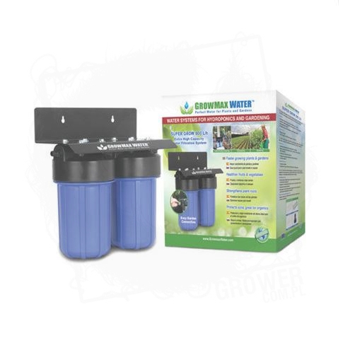 SUPER GROW firmy GrowMax Water to kompletny, dwufazowy system filtracji wody. Jest w stanie przefiltrować 800 litrów wody na godzinę. W porównaniu do osmozy nie ma efektu ubocznego jakim jest odpad wody. Idealnie nadaję się do użytku w małych, domowych ogródkach. W wszystkich systemach GrowMax Water zastosowano przyjazne środowisku kokosowo-węglowe filtry, które posiadają wysoki poziom absorbcji zanieczyszczeń.