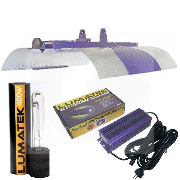 Kompletny zestaw oświetleniowy przeznaczony do uprawy roślin, składający się z odbłyśnika Adjust-A-Lite Lumatek, układu zapłonowego Lumatek SUPER LUMEN oraz lampy HPS przeznaczonej na obie fazy: wzrostu i kwitnienia DUAL
