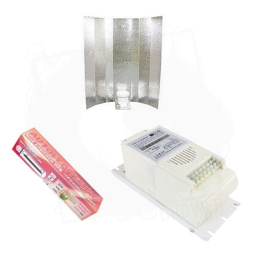 Kompletny zestaw oświetleniowy przeznaczony do uprawy roślin, składający się z odbłyśnika Hammered V 97%, układu zapłonowego LUMII Control Gear oraz lampy HPS przeznaczonej na fazę wzrostu i kwitnienia (Dual).
