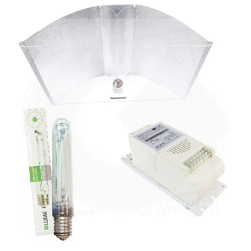 Kompletny zestaw oświetleniowy przeznaczony do uprawy roślin, składający się z odbłyśnika PEARLPRO XL, układu zapłonowego Lumii oraz lampy HPS przeznaczonej na fazę wzrostu i kwitnienia DUAL