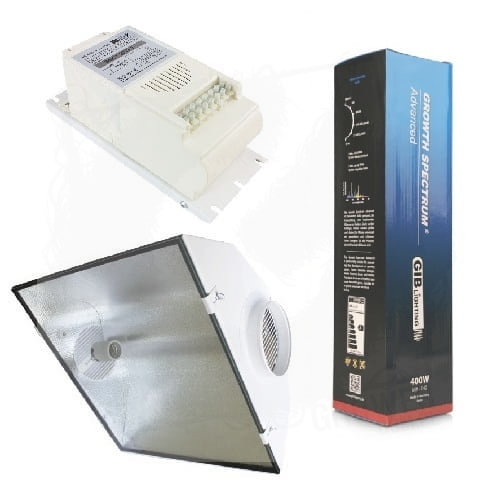Kompletny zestaw oświetleniowy przeznaczony do uprawy roślin, składający się z odbłyśnika wentylowanego Spudnik 2, magnetycznego układu zapłonowego firmy Lumii oraz lampy MH przeznaczonej na fazę wzrostu.